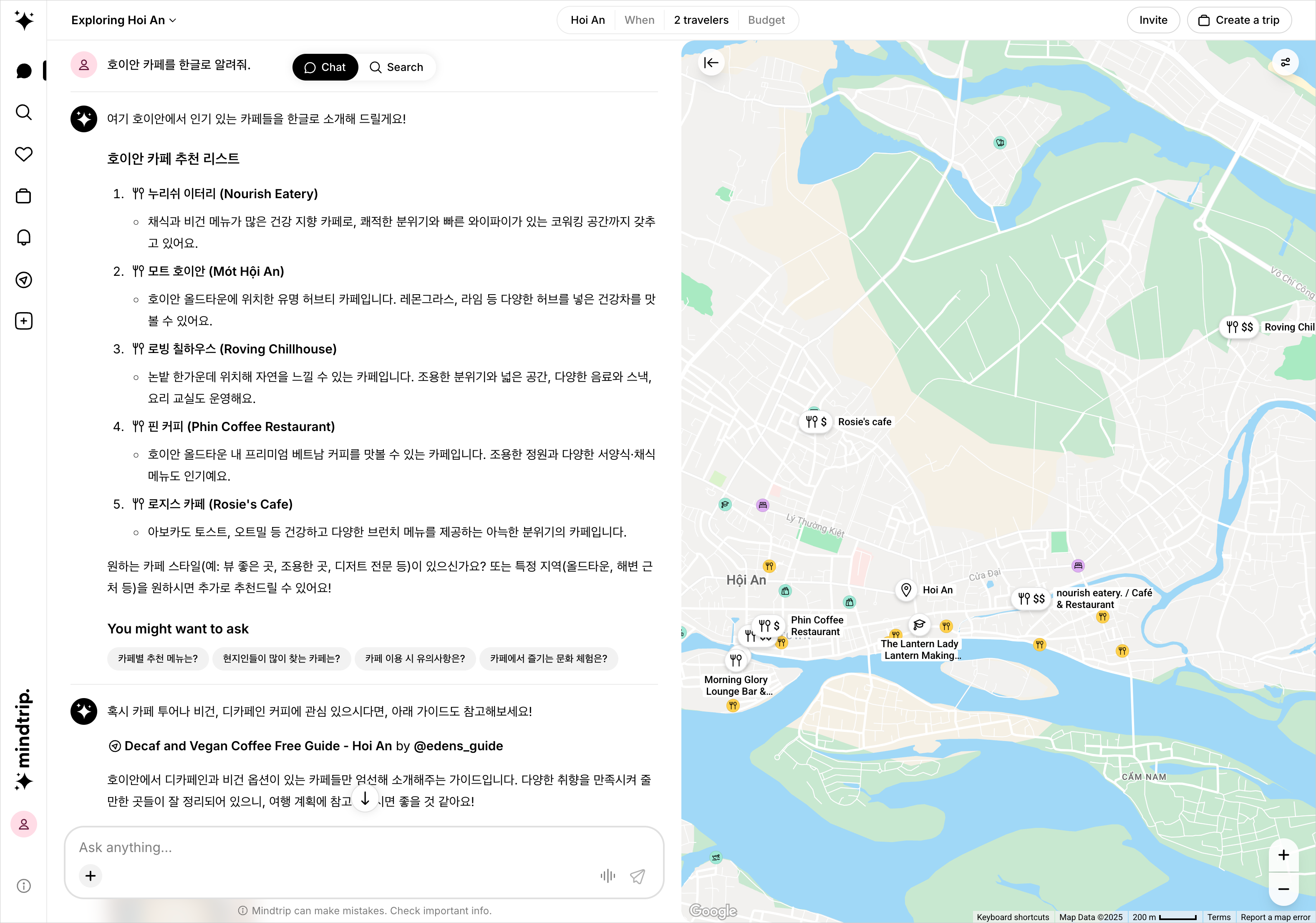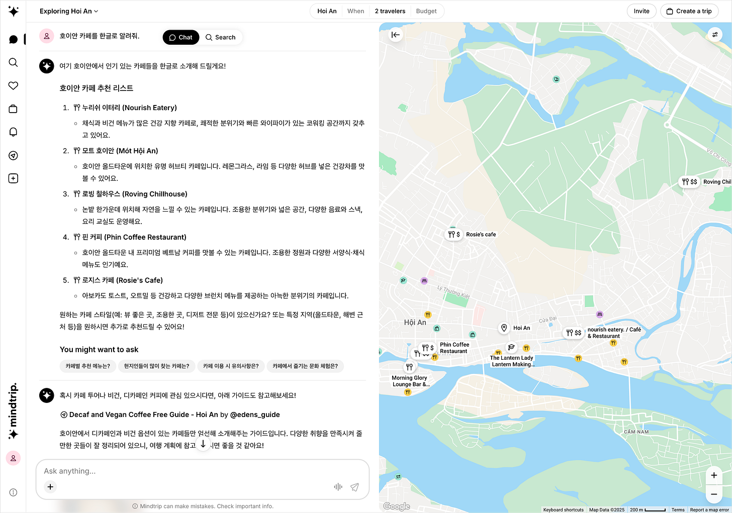 ๋ค์์ฃผ ๋ฒ ํธ๋จ ํธ์ด์์ผ๋ก ์ฌํ์ ๋ ๋๋๋ฐ, ์ฌํ์ ์ต์ ํ๋ ์ ํ์ด ๋ญ ์์๊น๋ฅผ ์ฐพ์๋ณด๋ค๊ฐ Mindtrip์ด๋ ์ ํ์ ์๊ฒ ๋์์ด์. AI ๊ธฐ๋ฐ ์ฌํ ํ๋ซํผ์ผ๋ก ์ฑํ ์ผ๋ก ๊ฐ์ธ ๋ง์ถคํ์ผ๋ก ์ถ์ฒ์ ํด์ฃผ๋ ์ ํ์ด์์. Perplexity์ ๋ค๋ฅด๊ฒ ์ฌํ์ ์ต์ ํ๋ ์ ํ์ด๊ธฐ ๋๋ฌธ์ ์ข ๋ ๋ฏฟ์๋งํ ์ ๋ณด๋ค์ด ๋์ค๋ ๊ฒ ๊ฐ์ต๋๋ค.