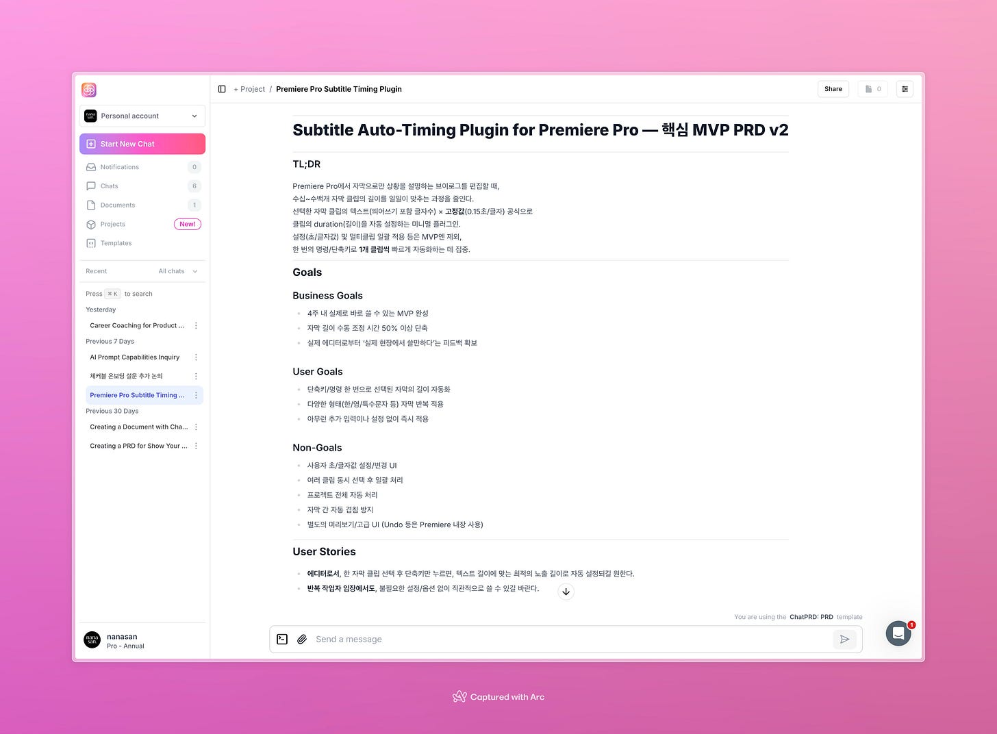 PRD๋ ์ ๋ฒ ์ฃผ๊ฐ ๊ธฐ๋ก์์ ๊ณต์ ํ๋ Chat PRD๋ก ๋ง๋ค์๋ค. ์๋ชป ์ ๋ฌํ ์ฌ์ค์ธ๋ฐ ์ค์ ์์ ์ธ์ด๋ฅผ ํ๊ตญ์ด๋ก ์ง์ ํ ์ ์์๋ค. ํ๋กฌํํธ๋ก๋ ๋ฌธ์ ์ ํด๊ฒฐ์ฑ ์ ๊ฐ๋จํ๊ฒ ์ ๋ฌํ๋ฉด์ 4์ฃผ ์์ ๋ง๋ค ์ ์๋ ์ค์ฝฅ์ผ๋ก ๋ง๋ค์ด ๋ฌ๋ผ๊ณ ํ๋ค.
