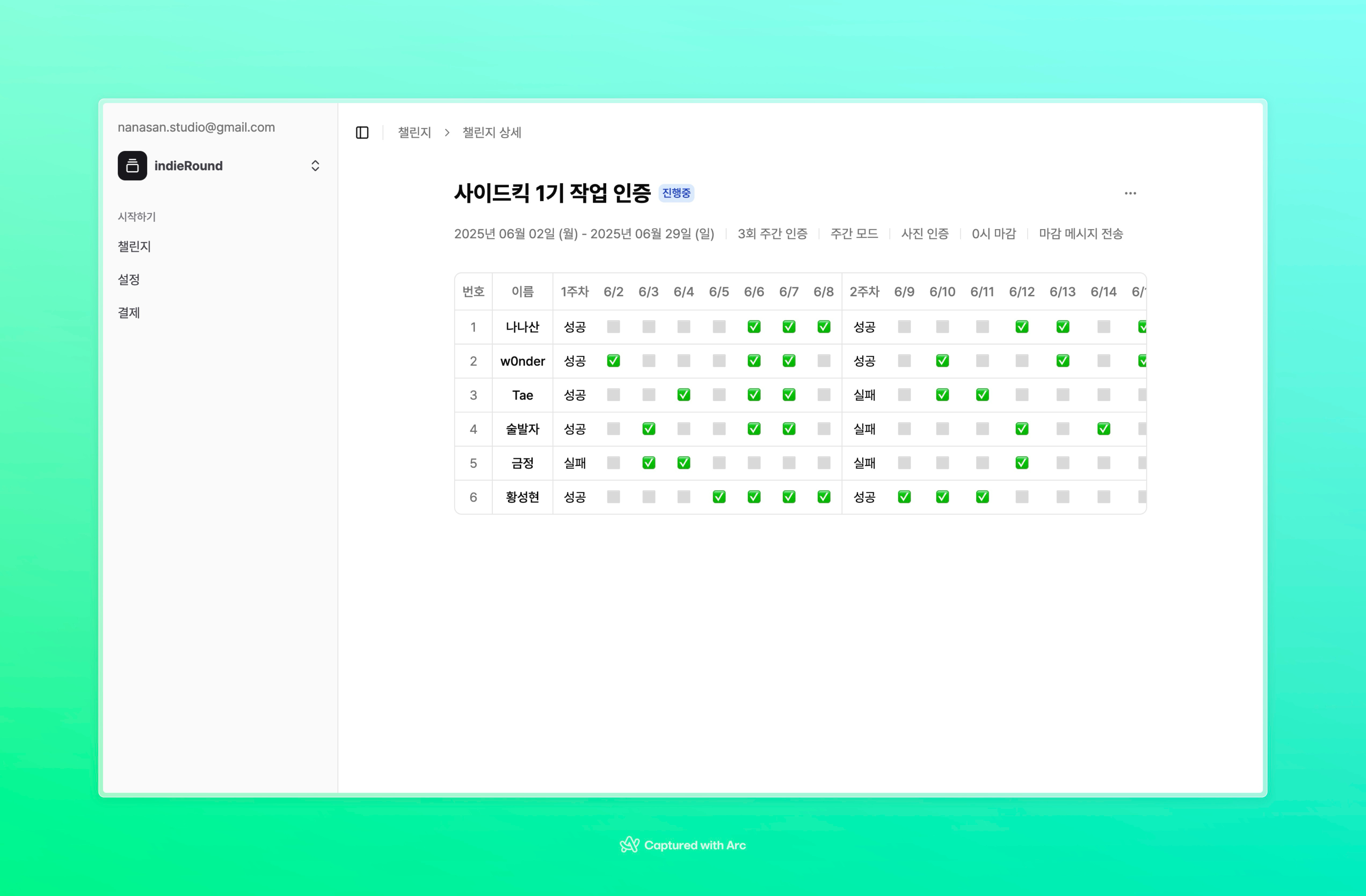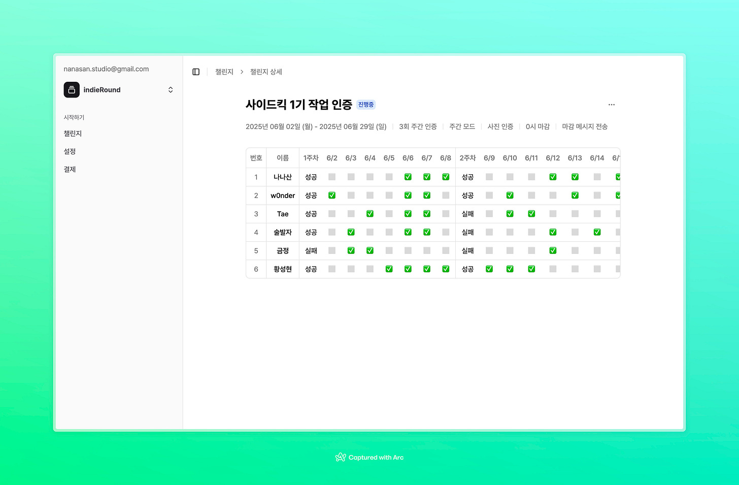 ์ด๋ฒ์ฃผ๋ ์ธ์ฃผ QA์ ์ ๊ฐ ๋ง๋๋ ์ฑ๋ฆฐ์ง ์ธ์ฆ ์๋ ๊ด๋ฆฌ SaaS ์ฒด์ปค๋ธ์ ์ฃผ๋ก ์์ ํ์ด์. ์ฒด์ปค๋ธ์๋ ๋ชฉํ ์ธ์ฆ ํ์๋ฅผ ๊ธฐ๋ฐ์ผ๋ก ์ฃผ์ฐจ๋ณ๋ก ์ฑ๊ณต๊ณผ ์คํจ๋ฅผ ํ๋จํ ์ ์๋ ๊ธฐ๋ฅ์ ๋ง๋ค์์ต๋๋ค.